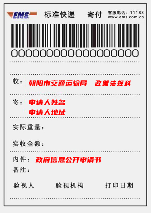 申请人可以通过信函方式提出申请。在信封显著位置注明“政府信息公开申请”字样,邮寄至朝阳市交通运输局法规科。信函应通过中国邮政的挂号信或EMS特快专递邮寄,不受理快递文件形式的申请。(特快专递申请式样详见附件2)